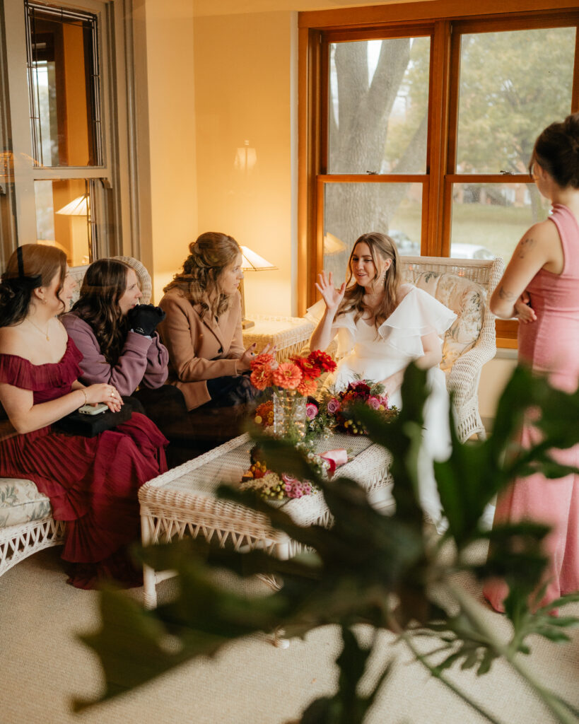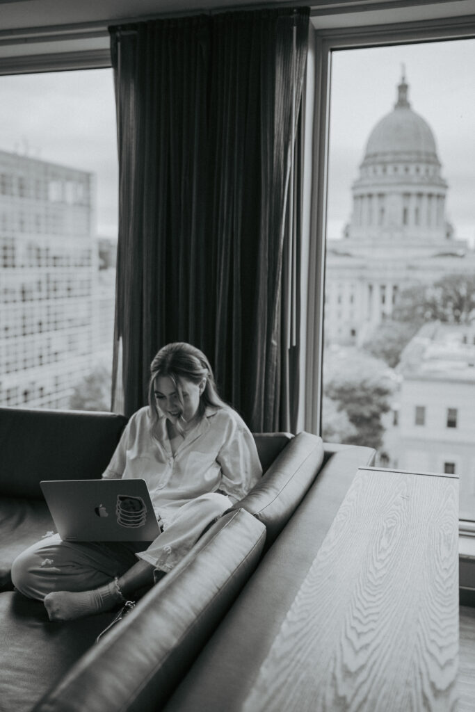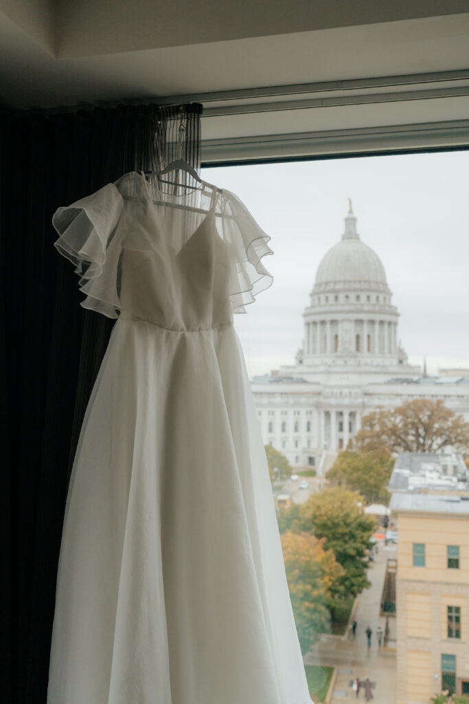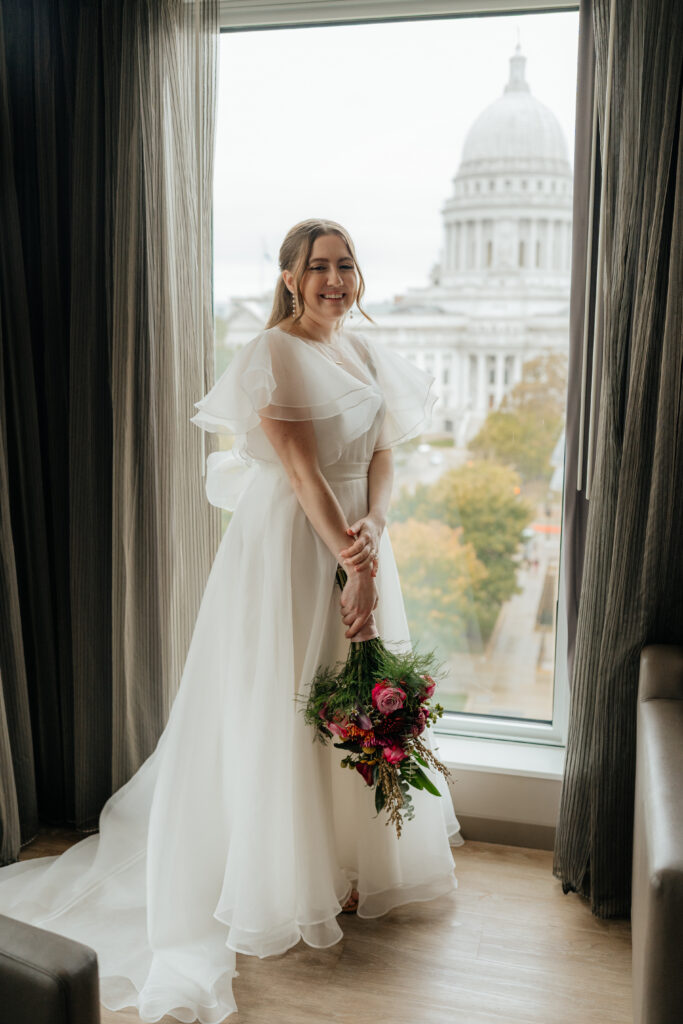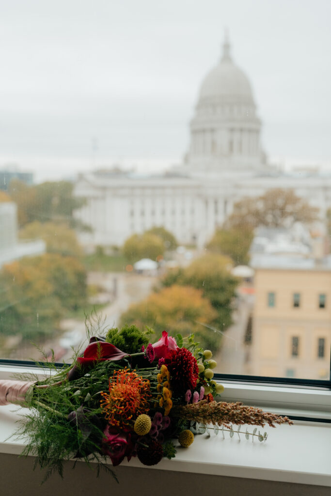 The day started at the Park Hotel in downtown Madison with views of the Wisconsin State Capitol and the kind of easy, warm morning energy that sets the tone for everything that follows. What made it feel especially personal was that Mariel’s friends helped craft her bridal bouquet right there in the suite together while Mariel was cozy on the couch editing her vows to Brian. Watching the people who love her most arrange flowers side by side was one of those small details that said a lot about who Mariel is and the relationships she holds close.