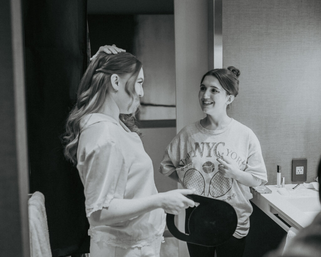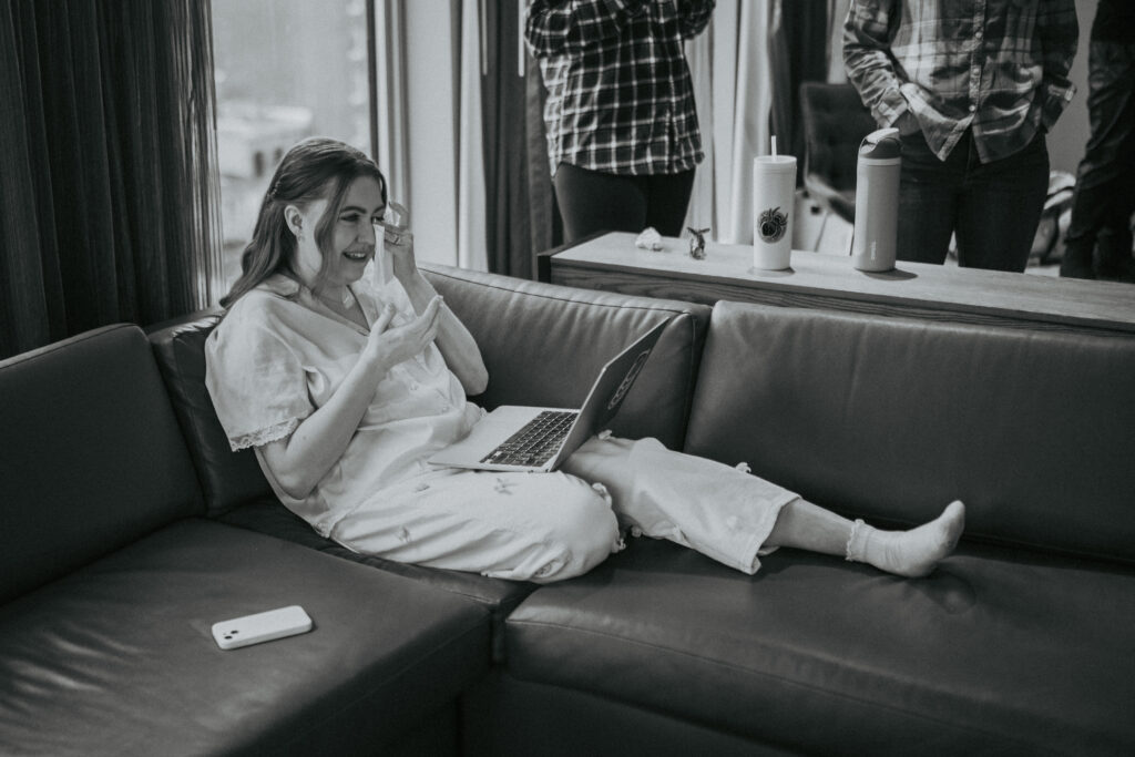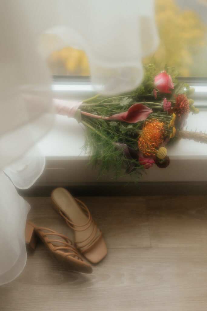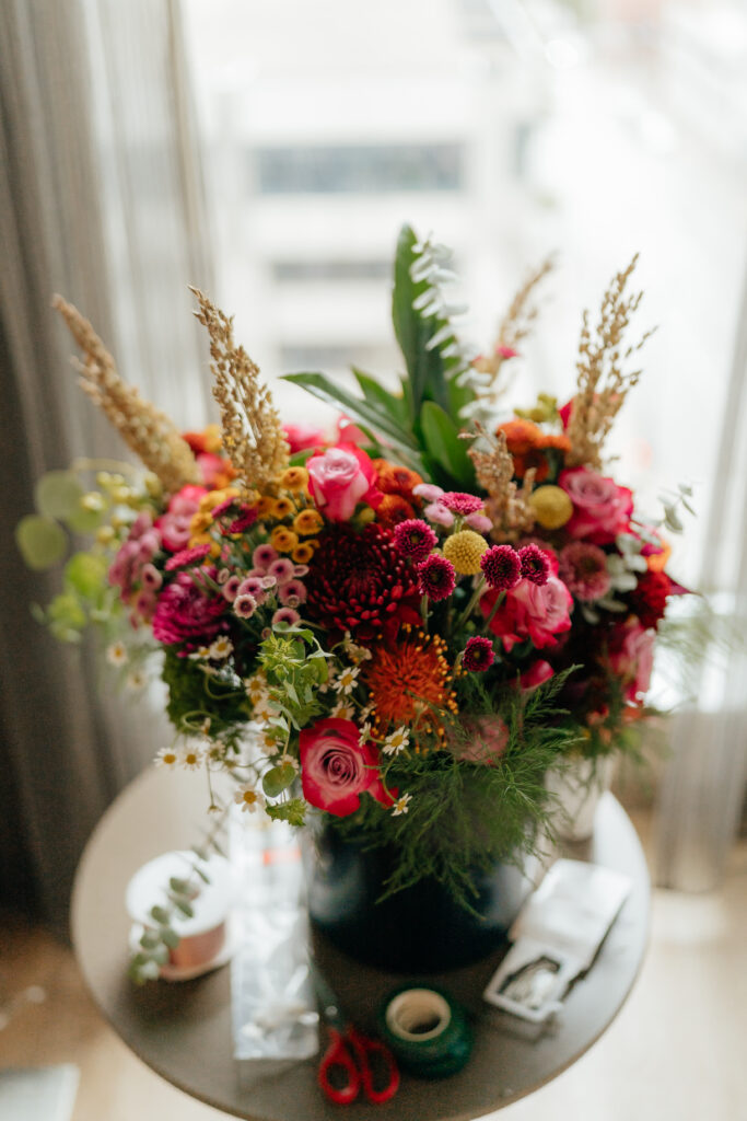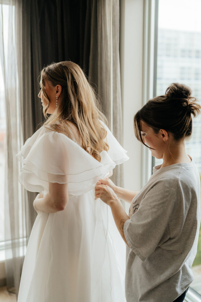 The day started at the Park Hotel in downtown Madison with views of the Wisconsin State Capitol and the kind of easy, warm morning energy that sets the tone for everything that follows. What made it feel especially personal was that Mariel’s friends helped craft her bridal bouquet right there in the suite together while Mariel was cozy on the couch editing her vows to Brian. Watching the people who love her most arrange flowers side by side was one of those small details that said a lot about who Mariel is and the relationships she holds close.