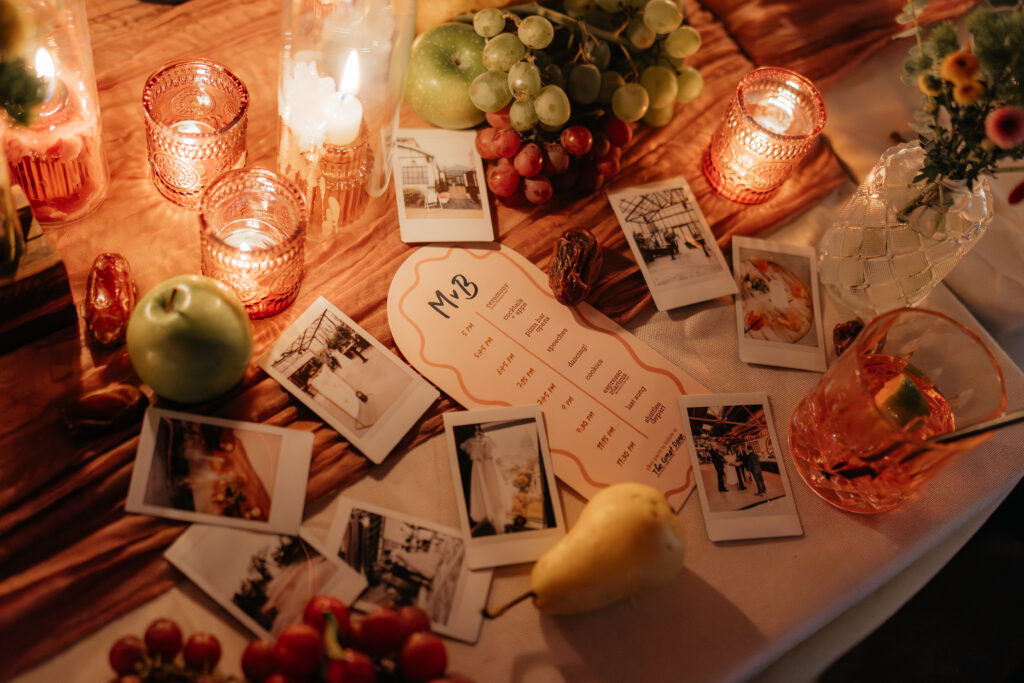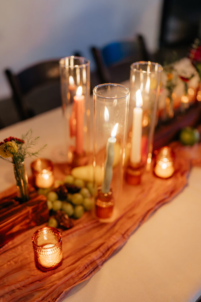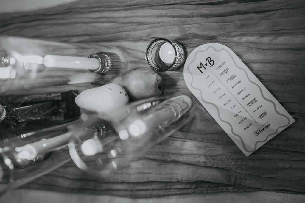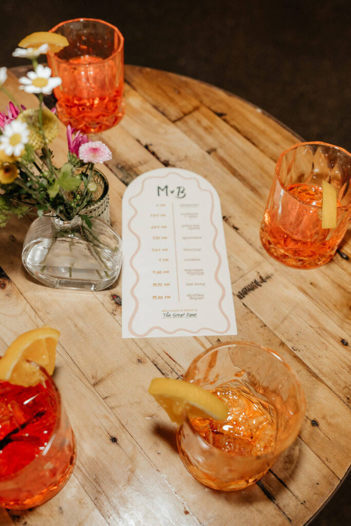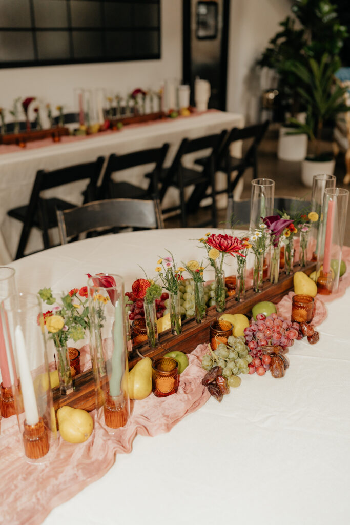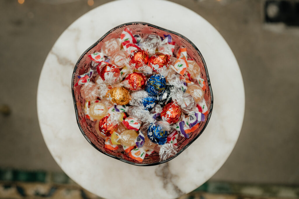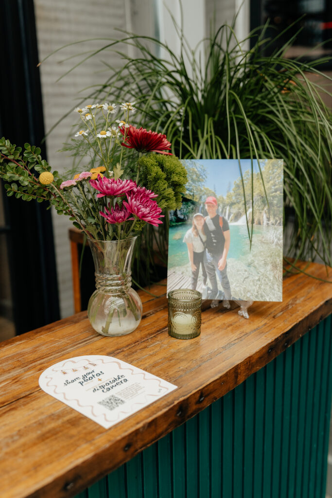 Before guests arrived, the team at Dream Weddings WI had transformed The Tinsmith into something that felt entirely like Mariel and Brian. Velvet chairs, photos from their relationship displayed throughout the space, candy they loved, fresh fruit, and flowers in every corner. It was cozy and personal and warm in the best way.